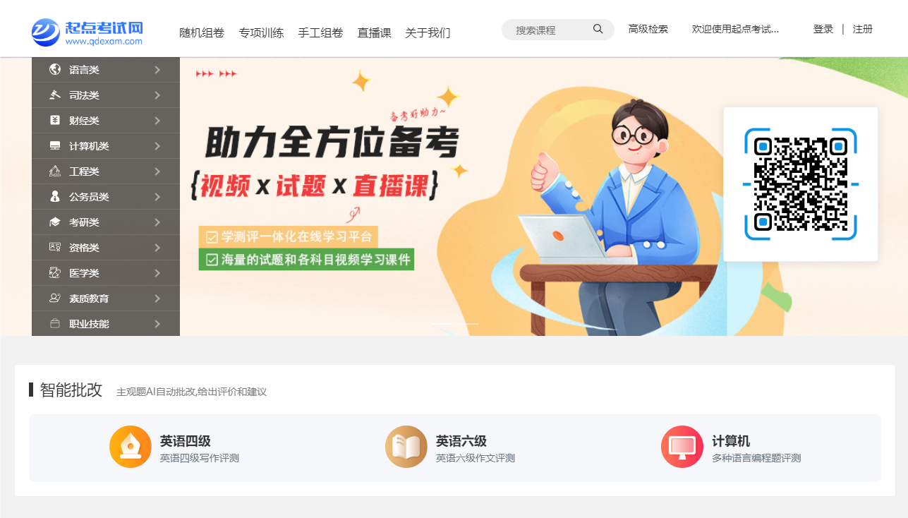 起点考试网是集学习与测评于一体的在线学习平台,资源丰富得超乎想象。从精心录制的视频课程,到海量的试题、试卷,再到实时更新的各类资讯,一站式满足你的所有学习需求。这里涵盖了语言、计算机、公务员、司法、财经、考研、工程、资格、医学、素质教育、职业技能等11大领域,囊括600多个职业资格考试、等级考试、学历考试科目。无论你是想考级提升自我,还是考证增加职业竞争力,在这里,都能找到取之不尽的学习宝藏。